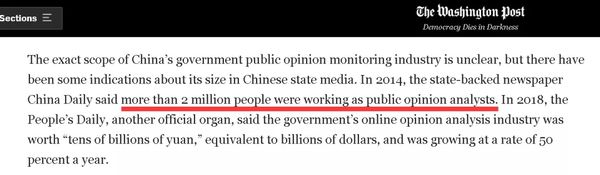 首先,为了歪曲中国的“网络舆情”行业,增加外国读者的恐惧感, Cate Cadell翻出了一篇2014年据称刊登在《中国日报》上的文章,称此文宣称中国有“200万网络舆情分析师”。同时,她采访了一个德国反华智库的“学者”,此人则相当“配合”地表示“这种规模太恐怖了”。