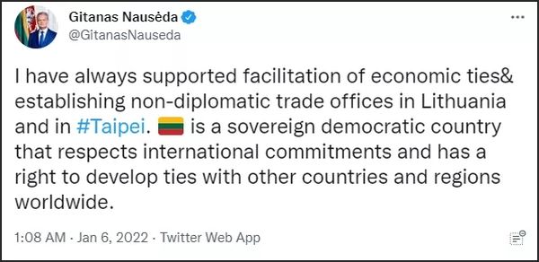 当地时间1月5日,立陶宛总统瑙塞达(Gitanas Nausėda)在推特宣布,“我一直以来都支持促进立陶宛与台北的经济纽带,以及双方互设非外交的贸易办事处。”