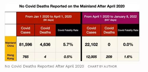 又比如,在另一篇文章中,George Calhoun又宣称,中国(31个省市区)自2020年4月1日武汉疫情基本结束,到2022年的1月8日,总共新增了约2.2万个新感染病例,可中国内地这期间却没有增加死亡病例,而同期的中国香港地区有12005人感染却死了209人,这不合理。