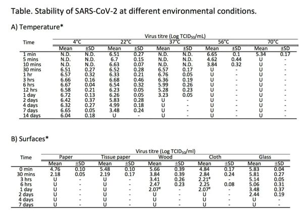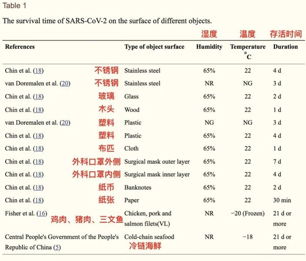 这是之前发在Transbound Emerg Dis.上的一项综述,其中列举了不同温度和湿度下不同冠状病毒在不同物体表面的存活时间,非常全面,包括: