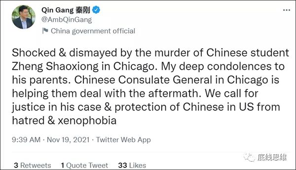 2021年11月19日,中国驻美大使秦刚发推特,对中国留学生在芝加哥不幸遇害深感震惊,对遇害者家属表示深切哀悼和诚挚慰问。