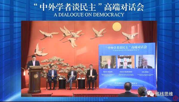 2021年12月2日,中国公共外交协会与中国论坛、CGTN(中国国际电视台)、观察者网,共同在北京国际俱乐部仙鹤厅举办了一场名为“中外学者谈民主”高端对话会,邀请了六位主讲人,分别是外交部副部长乐玉成、复旦大学中国研究院研究员李世默和我,还有三位大家比较熟悉的外国学者:英国的马丁·雅克和罗斯义、新加坡的马凯硕,他们通过视频连线参加。
