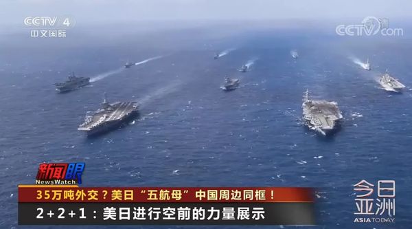 当地时间1月23日,日本海上自卫队发布消息称,日美两国舰艇于17-22日在冲绳以南的菲律宾海进行了大规模联合演练。美军出动了2个航母打击群和2个两栖攻击舰编队,日本方面则派出了一艘直升机驱逐舰。由于美军的两栖攻击舰和日本自卫队的直升机驱逐舰都采用了与航母一样的全通式甲板,因此也被归为“准航母”。有评论认为,这是美日一次空前的“五航母”力量展示。