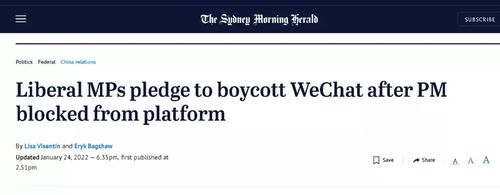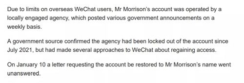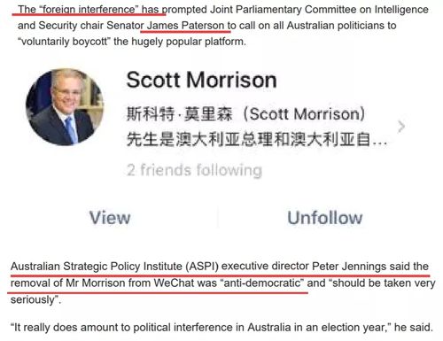 在一篇题为“斯科特·莫里森的微信账号被收缴,成了亲中政治宣传页面”的报道中,该报宣称莫里森在中国微信平台上曾经有一个有7.6万粉丝的账号,用来发布莫里森的相关活动与讲话内容,并与使用微信的澳大利亚的华人民众进行互动。但在本月初,他的这个账号突然被更名为了一个“给澳大利亚华人提供生活资讯”的账号,名为“澳华新生活”。可莫里森的政府却并未收到任何关于此事的通知。
