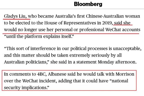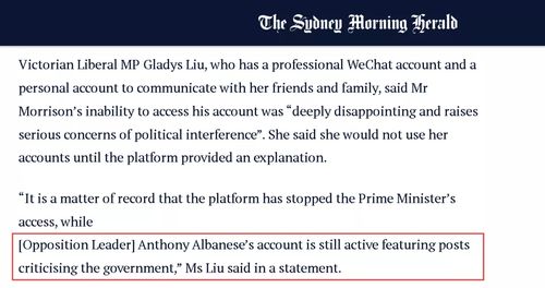 而根据《悉尼先驱晨报》的报道,莫里森的同党们,则趁此机会立刻对今年大选的竞选对手发难。比如一名与莫里森同属自由党的华裔女政客,就一边迅速表态她会主动“抵制”微信,不再用微信沟通自己的选民,一边立刻向阿尔巴尼西开炮,质问后者的微信账号为什么还可以发布“攻击澳大利亚政府”的内容。