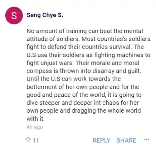 还有网友说:“再多的训练也挫败不了士兵的心态。大多数国家的士兵为保卫国家的生存而战。美国却把他们的士兵当作战斗机器去打非正义的战争。他们的士气和道德指南陷入了混乱和内疚之中……”↓