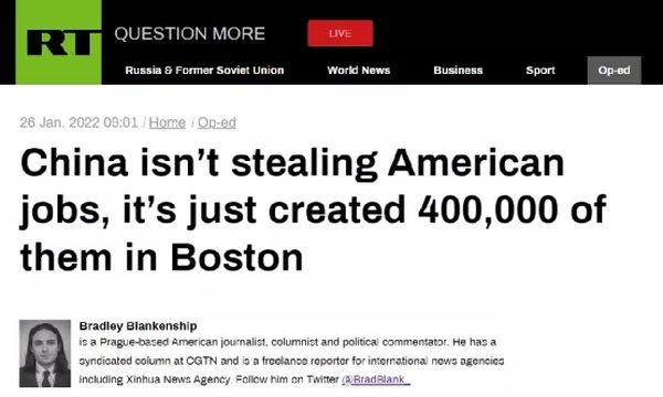 RT刊载美国记者文章:中国没有偷走美国的就业,它只是在波士顿创造了40万个就业岗位