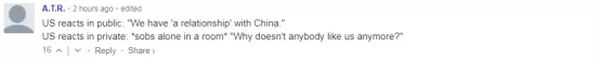 还有网友模仿起了美国的心理活动,“美国公开回应说:‘我们与中国有(自己的)‘关系’。美国私下反应:在房间里独自抽泣,‘为什么人们不再喜欢我们了?’”