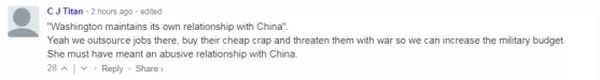 还有网友细数了美国对中国做的糟心事儿,“‘华盛顿与中国保持着自己的关系。’是的,我们在那里外包工作,买他们的廉价商品,用战争威胁他们,这样我们就可以增加军事预算。她一定指的是与中国的这种关系。”