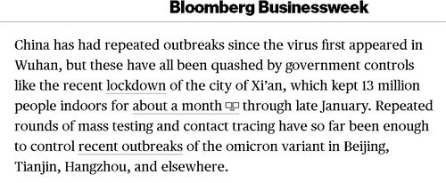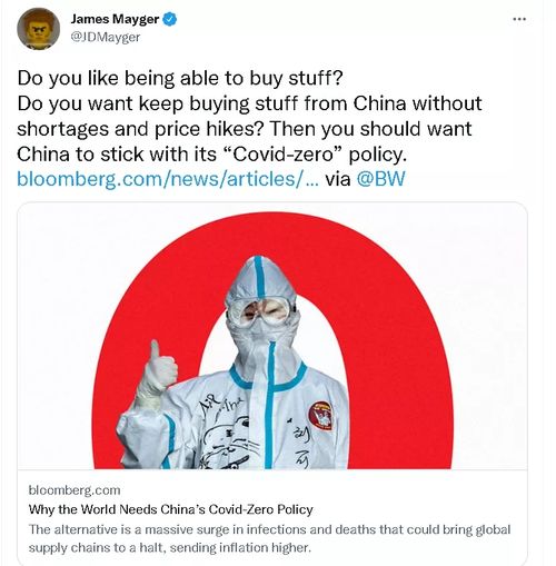 “你希望能继续买到东西吗?你想继续从中国买东西,不用担心短缺或价格上涨吗?那么,你就应该希望中国坚持‘动态清零’的政策”——彭博社的驻北京记者James Mayger,在他的社交账号上推荐他这篇题为“为什么世界需要中国的‘动态清零’政策”一文时,这样写道。