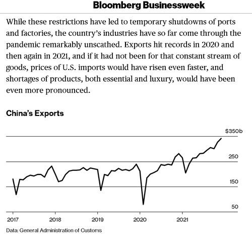 4、虽然中国的限制性政策令港口和工厂临时关闭过,但中国的工业在疫情这两年多的时间里其实并没受什么影响,出口在2020年和2021年还创下新纪录。如果不是中国有效的政策令物资源源不断地输出,美国进口产品的物价可能比现在涨得还要快,物资短缺也会更为严重。