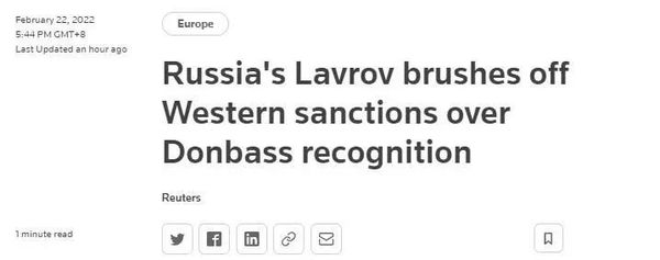 俄罗斯总统普京21日晚签署命令承认乌克兰东部的“顿涅茨克人民共和国”和“卢甘斯克人民共和国”,随后不久,美国及西方盟国对其制裁消息汹涌而来。据路透社报道,俄罗斯外交部长拉夫罗夫周二(22日)对此选择“无视”,表示不论如何西方都会制裁,他还称已经预见到俄罗斯承认乌东“两国”后其他国家的反应。