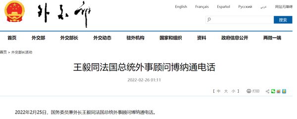 2022年2月25日,国务委员兼外长王毅同法国总统外事顾问博纳通电话。