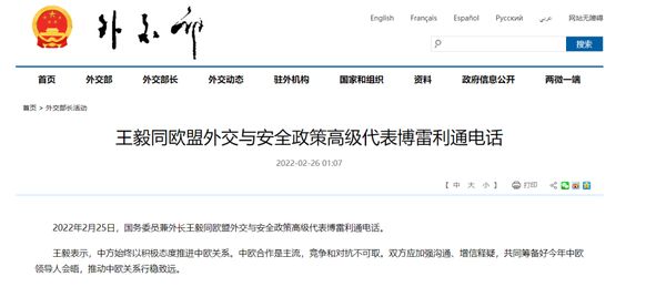 2022年2月25日,国务委员兼外长王毅同欧盟外交与安全政策高级代表博雷利通电话。