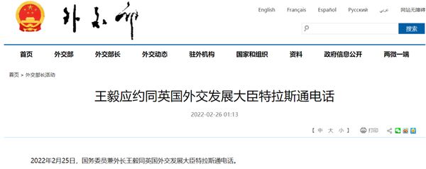 2022年2月25日,国务委员兼外长王毅同英国外交发展大臣特拉斯通电话。