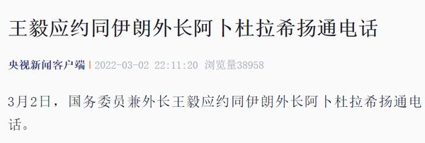 3月2日,国务委员兼外长王毅应约同伊朗外长阿卜杜拉希扬通电话。