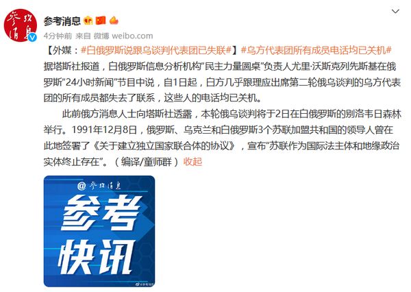 据塔斯社报道,白俄罗斯信息分析机构“民主力量圆桌”负责人尤里·沃斯克列先斯基在俄罗斯“24小时新闻”节目中说,自1日起,白方几乎跟理应出席第二轮俄乌谈判的乌方代表团的所有成员都失去了联系,这些人的电话均已关机。