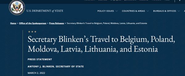 当地时间3月2日,美国国务院网站发布消息,布林肯将于3月3日至8日访问比利时、波兰、摩尔多瓦、拉脱维亚、立陶宛和爱沙尼亚六国,与北约盟国及欧洲伙伴就俄乌局势进行协调。