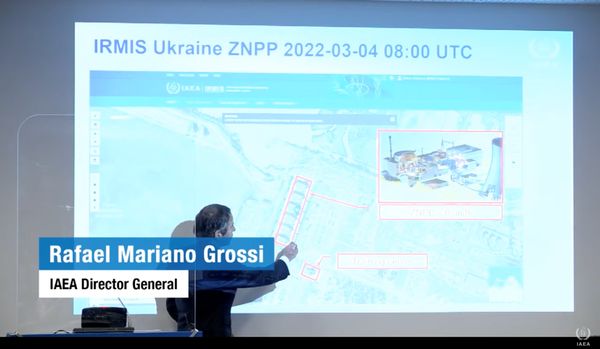国际原子能机构主席格罗西在发布会上解说扎波罗热核电站示意图,左边红框为6个核反应堆,右边红框为起火的培训大楼。