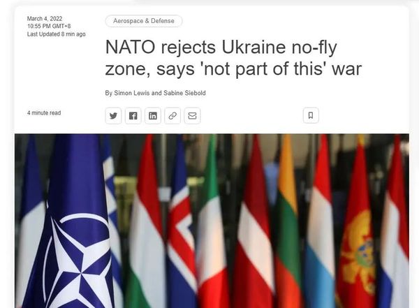 3月4日,北约拒绝了乌克兰要求其在该国上空设立禁飞区的要求,北约秘书长斯托尔滕贝格表示,设立禁飞区会导致俄乌冲突从乌克兰国内升级为“野蛮的、波及欧洲的战争”。北约秘书长还以非常冷静的态度表示:“我们不是这次冲突的一部分,我们有必要避免这场冲突升级并蔓延至乌克兰以外。”