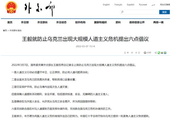 第二,要防止出现大规模人道主义危机。中方愿就此提出六点倡议:一是人道主义行动必须遵守中立、公正的原则,防止将人道问题政治化;二是全面关注乌克兰的流离失所者,帮助他们得到妥善安置;三是切实保护平民,防止乌境内出现次生人道灾害;四是保障人道援助活动顺利、安全开展,包括提供快速、安全、无障碍的人道主义准入;五是确保在乌克兰外国人安全,允许他们从乌克兰安全离开,并为他们回国提供帮助;六是支持联合国在对乌克兰人道援助方面发挥协调作用,支持联合国乌克兰危机协调员的工作。