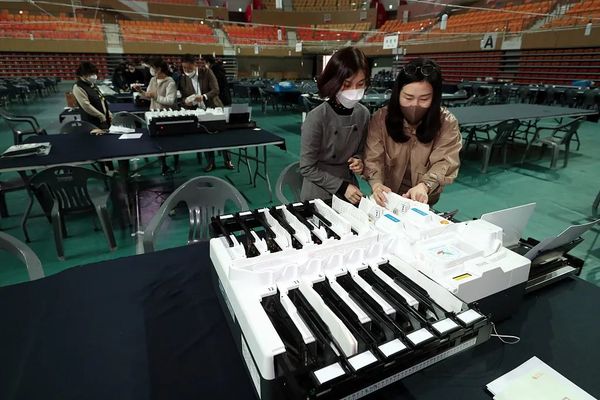 资料图:当地时间2022年3月8日,韩国大选倒计时一天,相关人员正在进行设备最后的检查和培训。
