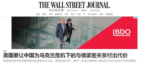 这也跟《华尔街日报》最近的一篇文章——“美国要让中国为乌克兰危机下的中俄关系付出代价”的内容相互印证,可谓图穷匕见。