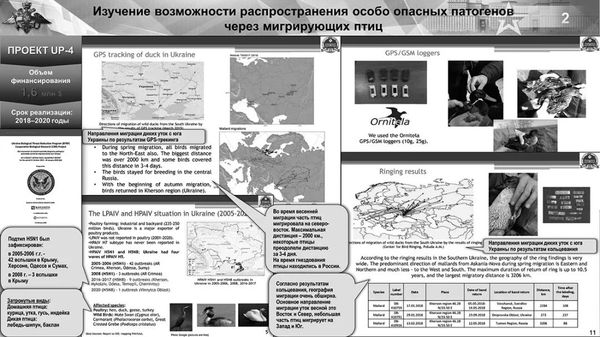 据塔斯社10日报道,俄军“三防”(防辐射、化学和生物武器)部队司令基里洛夫中将当天在发布会上介绍了美国及其北约盟友在乌克兰实施军事和生物计划的细节。他表示,由美国命令实施的UP-4 项目(下图)由基辅、哈尔科夫和敖德萨的实验室参与。其目标是研究通过候鸟传播特别危险病毒的可能性,包括高致病性 H5N1 禽流感,其对人类的致死率达到 50%。由于乌克兰独特的地理位置,鸟类的迁徙路线横贯欧亚大陆,因此该项目框架内研究了145 种生物物种。此外,美国在乌克兰的P-781项目考虑将蝙蝠作为潜在生物武器制剂的载体。该项目包括研究能够从蝙蝠传播给人类的细菌和病毒病原体:鼠疫、钩端螺旋体病、布鲁氏菌病和丝虫病毒。俄国防部强调,这些研究是在紧邻俄罗斯边境的黑海沿岸和高加索地区进行的。他还专门提到,上世纪40年代,专门从事生化武器研究的日本731部队的成员在战后逃往美国。