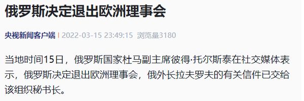 俄罗斯决定退出欧洲委员会当地时间15日,俄罗斯国家杜马副主席彼得·托尔斯泰在社交媒体表示,俄罗斯决定退出欧洲委员会,俄外长拉夫罗夫的有关信件已交给该组织秘书长。……