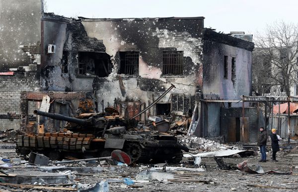 3月15日,顿涅茨克再遭圆点-U导弹攻击,图中为受损的装甲车。图自澎湃影像