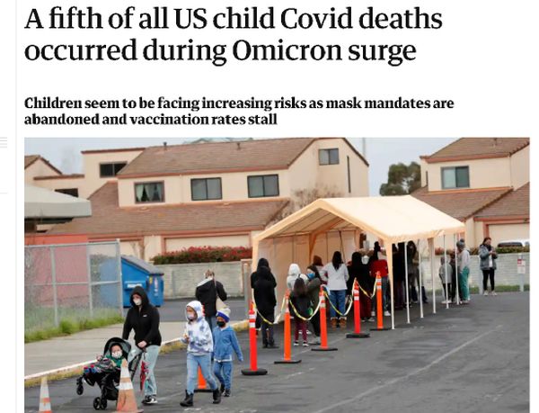 英国《卫报》在最近的一篇报道中就指出,自奥密克戎毒株于今年初在美国各地扩散开来后,美国在今年前两个多月时间里因新冠疫情死亡的儿童数量出现了明显的增加,已经占到了自2020年春季疫情暴发以来儿童总死亡人数的20%。