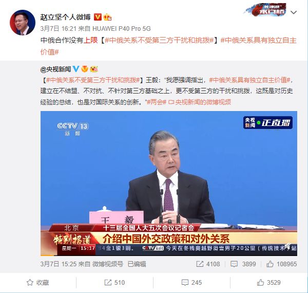 ▲3月7日,在媒体发布国务委员兼外长王毅对中俄关系表态的视频之后,外交部发言人赵立坚在社交平台上转发相关视频,并且配文称:“中俄合作没有上限”。