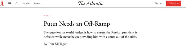 ▲《大西洋月刊》近日刊载了其驻伦敦特约撰稿人汤姆·麦克塔格题为“普京需要一条出路”的文章。
