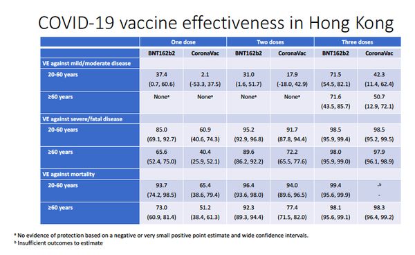 3月22日,香港大学李嘉诚医学院发布了一份名为“香港第五波疫情的前瞻性规划”的研究,其中一组来自香港的疫苗有效性数据显示,对于60岁以上老人来说,接种三剂次的科兴和复必泰(BNT162b2)疫苗,防重症、防死亡的有效率,都超过了90%。