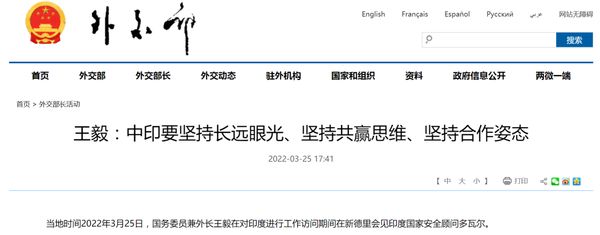 王毅:中印要坚持长远眼光、坚持共赢思维、坚持合作姿态当地时间2022年3月25日,国务委员兼外长王毅在对印度进行工作访问期间在新德里会见印度国家安全顾问多瓦尔。……