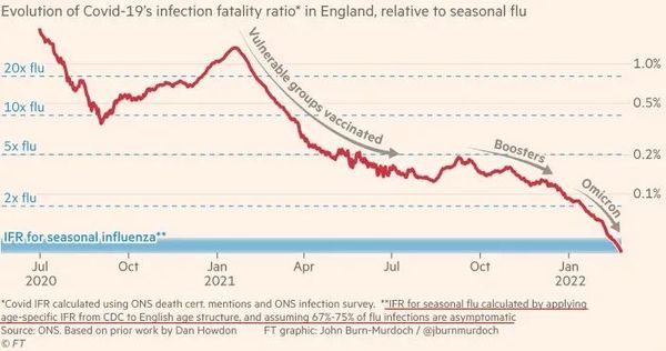 比如,英国的《金融时报》就煞有介事地发表文章,声称感染奥密克戎的致死率(IFR,infection fatality rate,也有用risk或proportion的)已经低于流感。只不过,它用来对比的数据是新西兰流感……