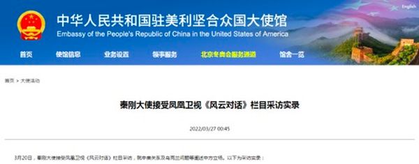 3月20日,秦刚大使接受凤凰卫视《风云对话》栏目采访,就中美关系及乌克兰问题等阐述中方立场。以下为采访实录: