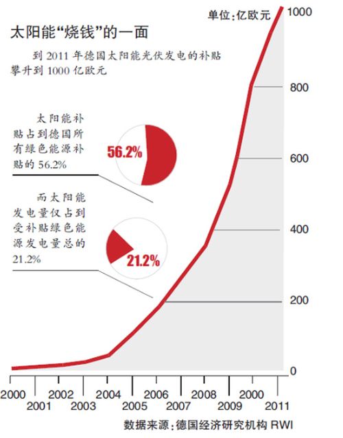 德国从2000年颁布《可再生能源法》开始搞光伏补贴政策,2004年修改法律文本,由补贴企业转向补贴居民,进一步加强补贴力度,10年时间,累计补贴总额超过1000亿欧元,占德德国政府在新能源领域补贴总额的56.2%,是中国的3倍之多。