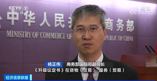 商务部国际司副司长 杨正伟:《升级议定书》在货物(贸易)、服务(贸易)、投资市场准入和规则方面的内容,甚至超越了RCEP水平。另外,《升级议定书》还在原产地自主声明制度、货物快速放行以及电子商务等领域,看齐了RCEP水平。