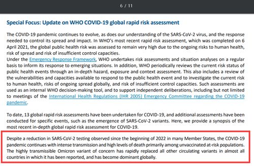 世卫组织在该部分指出,尽管自2022年以来“很多成员国”都被发现在“减少(新冠肺炎)检测”,但新冠疫情仍在继续——且传播得很猛烈,对于那些没打疫苗的高危人群来说,他们的死亡情况也十分严重。(我们也贴出了这段话的原文和在报告中的所在段落,如下图所示)