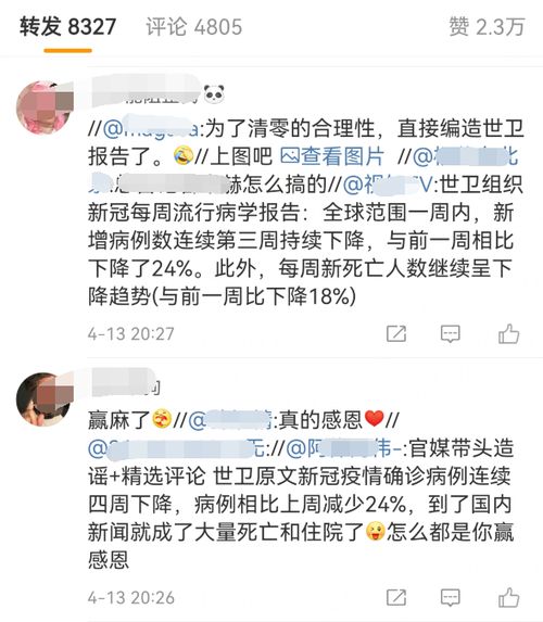 在这些人的指控下,网络上很快又出现了诸如宣称中国媒体是“为了清零(政策)的合理性,编造世卫报告”的说法。