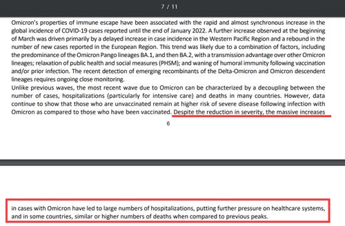 世卫组织还在这部分指出:尽管奥密克戎的毒性有所减弱,但大规模的病例增加已经导致了大量病例的入院,给医疗系统带来了更多压力,一些国家甚至还出现了与之前几轮疫情中峰值相同甚至更高的死亡病例数。(原文及其所在段落如下图所示)