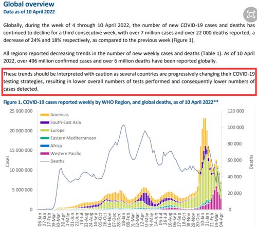 那么综合世卫组织在这份4月12日的疫情周报中的信息,我们就不难发现那家中国媒体的报道并没有什么问题,世卫组织对于新冠疫情的发展趋势更保持着很高的警惕性——尤其是,世卫组织不仅没有被所谓的新增病例数和新增死亡病例数表面上的“双双下降”所迷惑,清楚地指出了这与各国减少检测量有关;该组织还清醒地看到,奥密克戎虽然在重症和死亡上没有前几波疫情猛烈,但其所带来的大规模感染却令感染者的基数大大增加了,所以仍然会给医疗系统带来很大冲击,甚至会给一些发展中国家带来更高的死亡病例。
