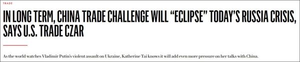 报道称,俄乌冲突极大地动摇了当前的全球贸易,这迫使美国采取新的外交策略。对此戴琪认为,由于中国贸易正发挥举足轻重的作用,美国需要在贸易问题上“变得更具战略性”。