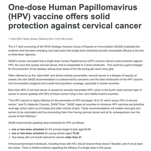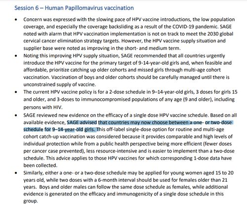 需要注意的是,SAGE在会议纪要中指出,其审视了单剂HPV效力的新证据,建议9-14岁女性接种1剂次或2剂次,单剂次提供了相当的和高水平的保护能力,从公共卫生角度来看,更有效(每个癌症预防所需剂量更少),少占资源且更容易实施。同样,1剂次或者2剂次也适用于15至20岁女性。