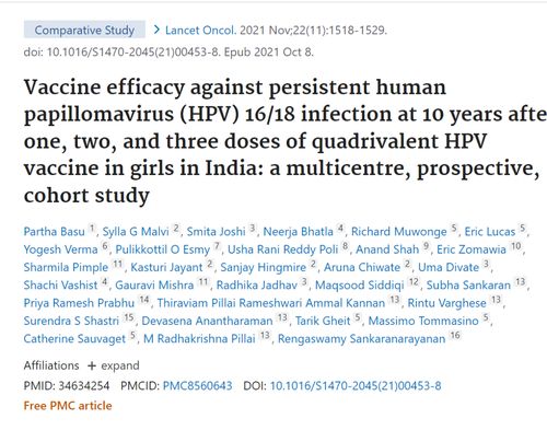 2021年10月,柳叶刀子刊Lancet Oncology曾刊发的来自国际癌症研究机构Partha Basu领衔的一项研究结果显示,接种后近10年内,单剂四价HPV疫苗对高危型HPV16和HPV18持续感染提供的保护效果与两或三剂四价苗相当,均能达到90%以上。约70%的宫颈癌是由HPV16和HPV18两个病毒亚型的病毒感染导致。