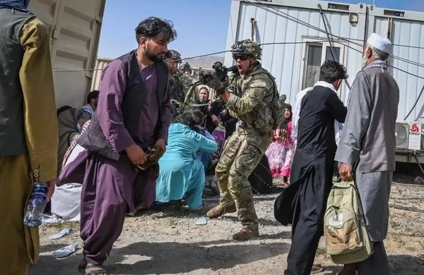 2021年8月16日,一名美军在阿富汗喀布尔机场,用枪指着试图从机场撤离的阿民众