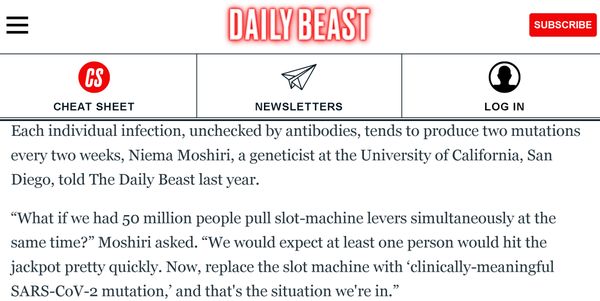 “如果有5000万人在同一时间一起玩‘老虎机’,可以预见至少会有一个人能很快就赢得大奖”,这名专家打比方说,“那么,将‘老虎机’换成‘临床上有意义的新冠病毒变异’,这就是我们面临的情况”。