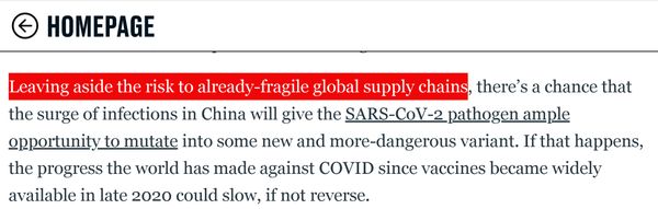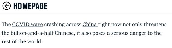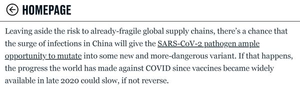 而他的核心依据是,如果疫情在拥有14亿人口的中国失控,那么中国庞大的人口基数就会成为新冠病毒的培养皿,有可能令病毒出现更危险的变异,这将导致自2020年以来全世界为对付新冠疫情而取得的进展被“延缓”,甚至不排除被“逆转”。