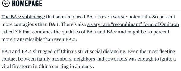 另外,在文章的其他部分,《每日野兽》的记者则突出讲述了奥密克戎毒株——尤其是BA.2变种及其之后的变种在传染性上的恐怖、中国老年人在疫苗接种上仍然不足的问题、以及疫苗有效力会逐渐消失的问题等等。这些内容自然都是为了进一步凸显疫情在中国失去控制的风险。